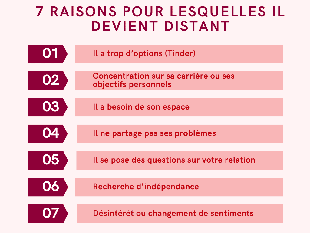 Ce point-ci est le moins réjouissant. Vous l’avez peut-être vécu dans le sens inverse. En devenant distante avec un homme, vous savez que dans la majeure partie des cas, vous ne resterez pas avec lui. Ici, c’est peut-être lui qui n’est pas certain de vouloir poursuivre. Les motifs peuvent être de tout ordre !